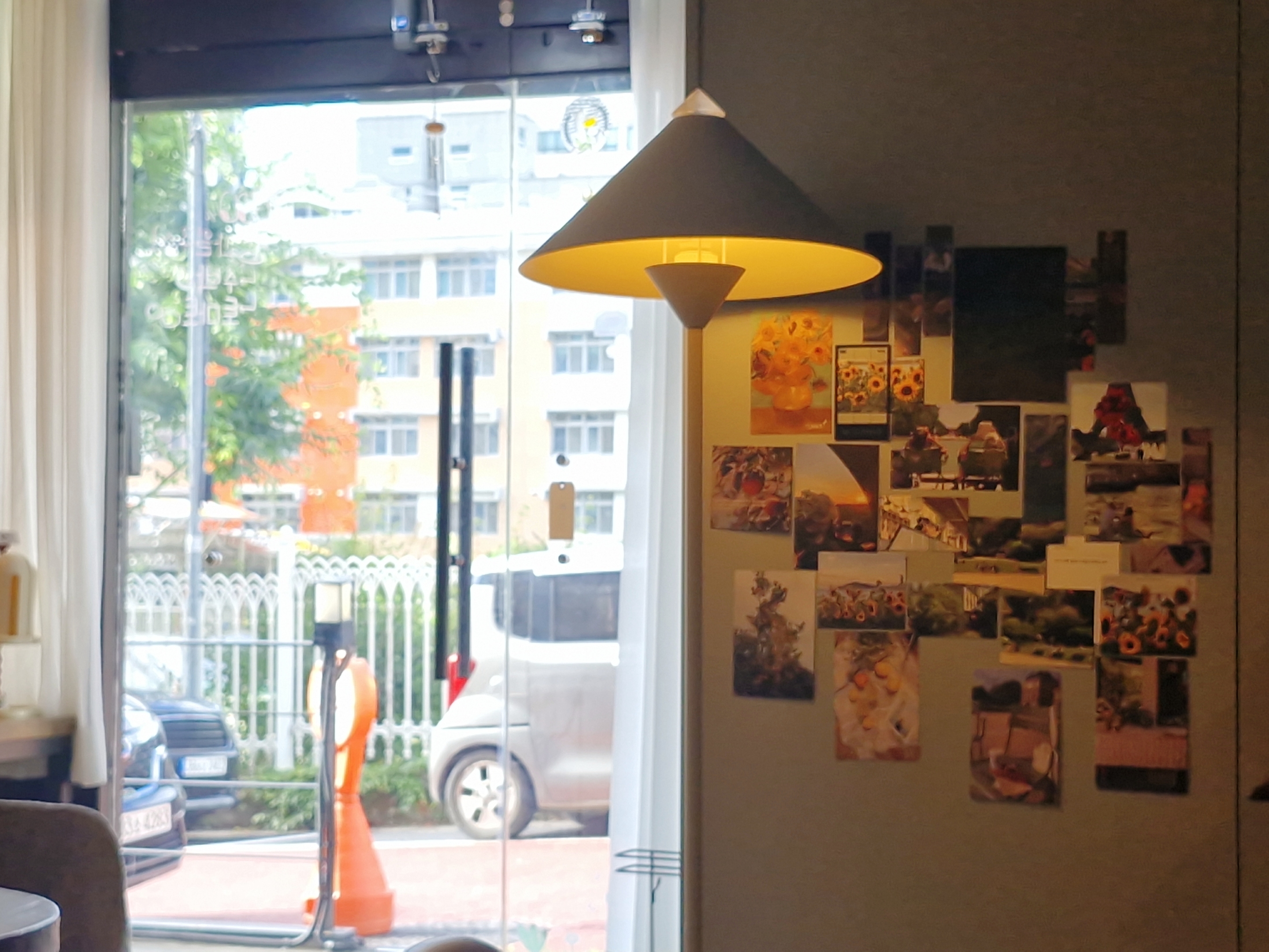 카페 곳곳에 놓여진 소품과 편안한 조명, 사진들,